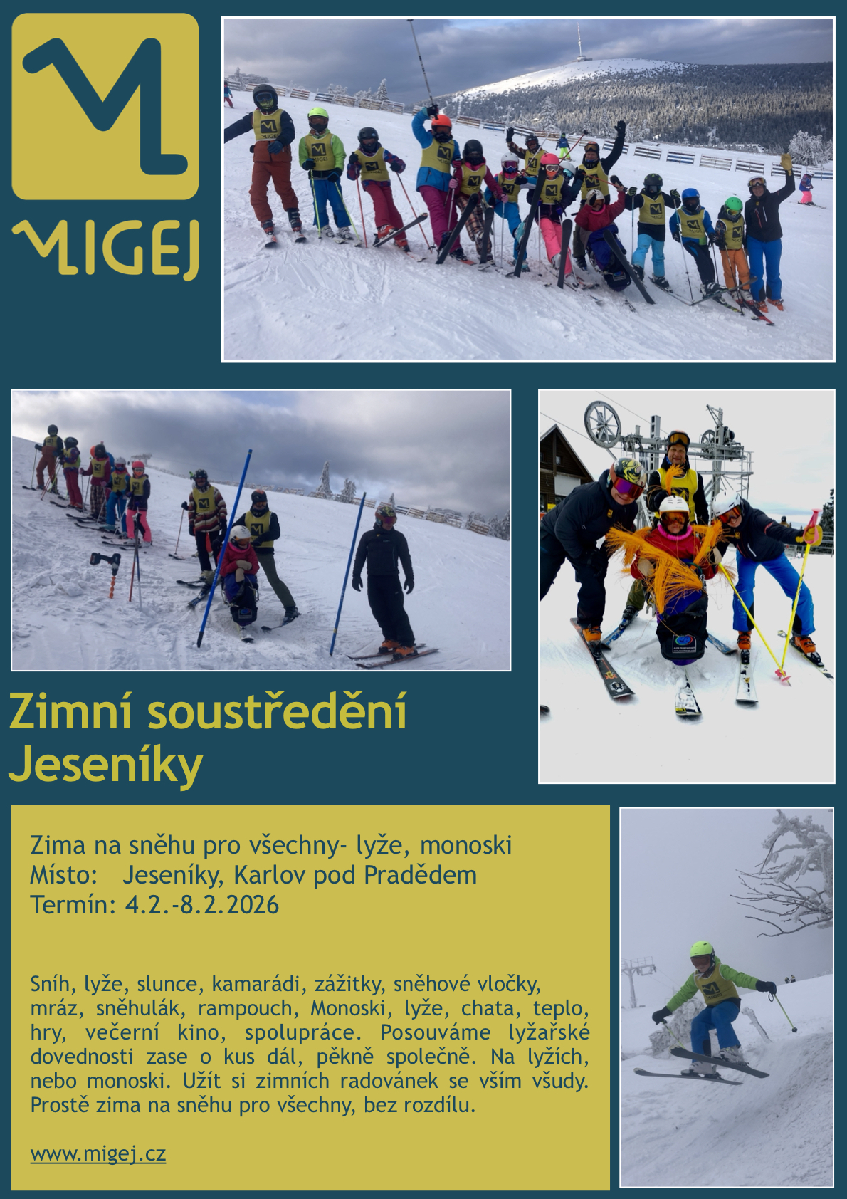 Zimní soustředění na sněhu pro všechny. Soustředění je určeno pro děti od 9 let a také pro dítě s handicapem, které by bez monoski nebylo schopno pohybu na sjezdovce. Dítě s handicapem má pobyt dotován sponzorsky. Monoski zajištěno. Na fotky z loňského soustředění můžete kouknout zde.